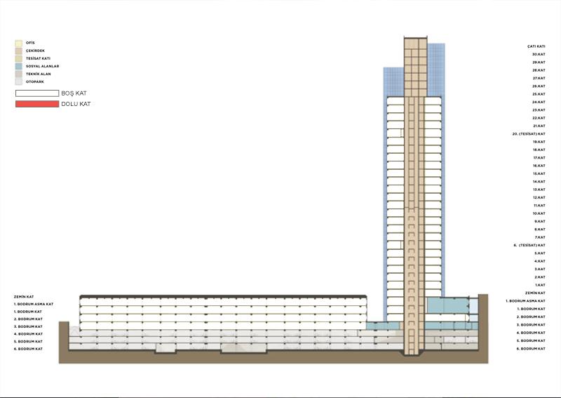 | VENTILATION SYSTEM | The infrastructure of the office floors will be prepared fresh air and exhaust systems for each individual office, the heat recovery unit type will be made by the central ventilation air handling units. 10 m² / person admission and 50 m³ / h fresh air will be provided. Office floors will be made central air conditioning in wet areas. In the parking floors normal ventilation and smoke exhaust system will be implemented as fan'l jet system. Smoke evacuation system on all floors, fire escapes and emergency elevator pressurization will be applied. |